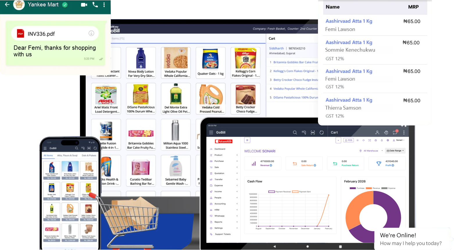 Manage standard/combo/digital/service products with variants, IMEI, batches and expiry dates.
